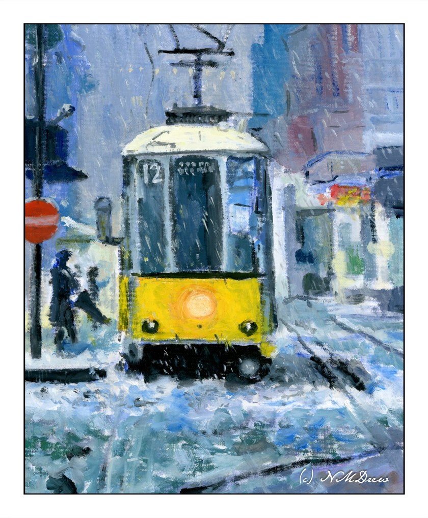 Pixabay is a wonderful source for photos for painting subjects. Resources like this allow you – the artist or whoever – to explore worlds new to you. I, for one, doubt I shall ever visit a city with yellow trams unless I travel far from my current stomping grounds. This painting is derived from one such photo.