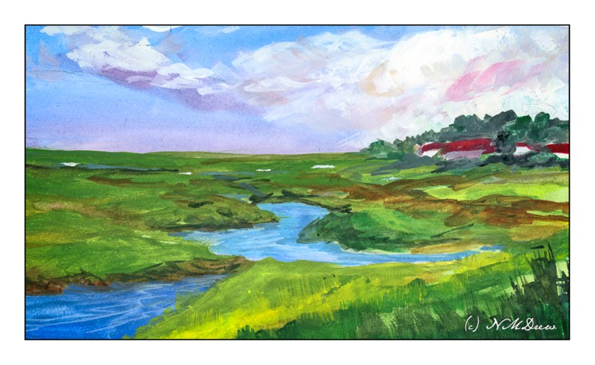 My palette was restricted to titanium white, cadmium lemon, yellow ochre, cadmium red light, alizarin crimson, magenta, cerulean blue, ultramarine blue, burnt umber, and ivory black. The Arches “Huile” paper is rather nice, a bit pricey, but has a nice tooth. Other oil / acrylic papers I have used have smoother textures. Both are pleasant under the brush.