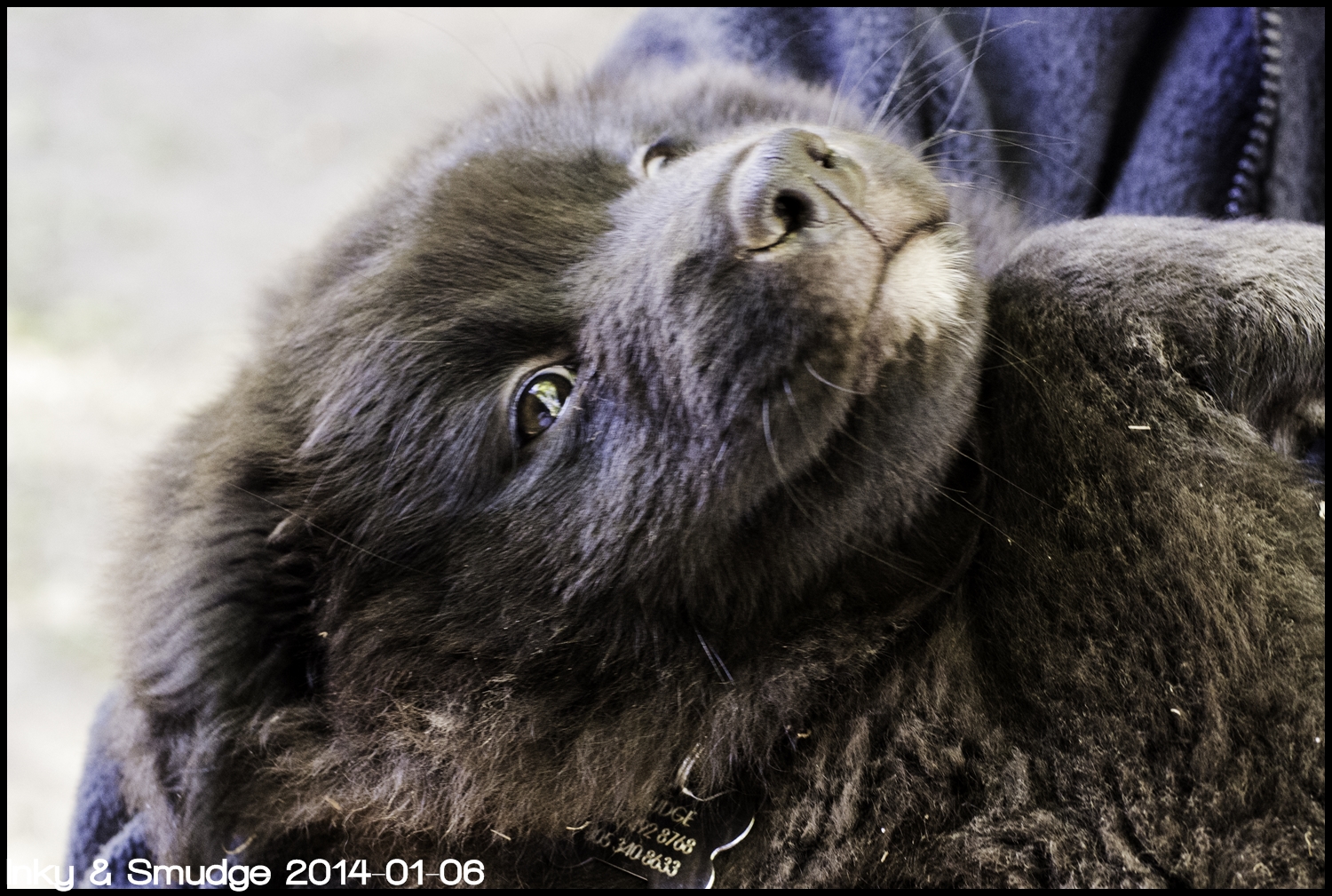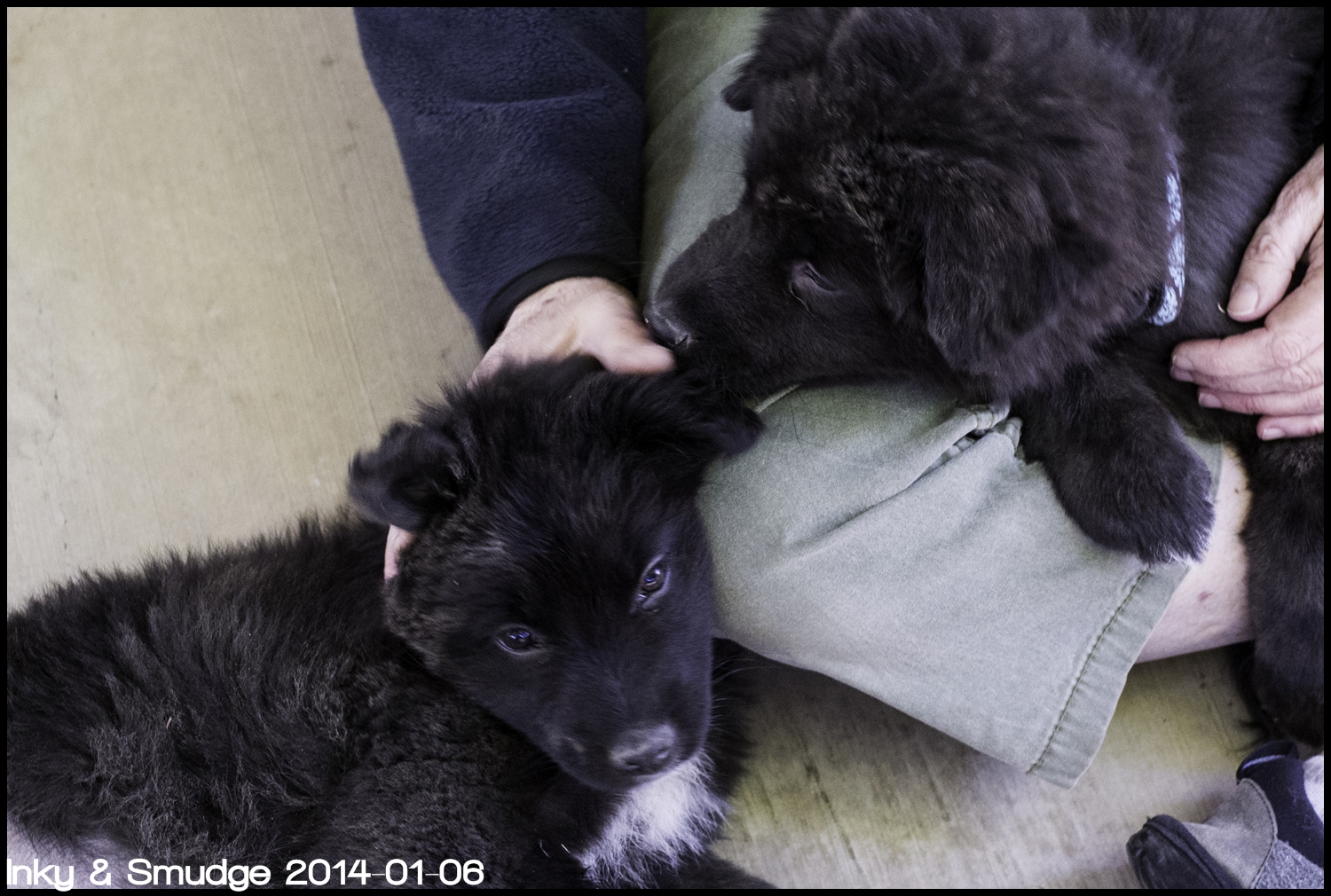Let me introduce you to two new family members: Inky and Smudge, labrador-Aussie mix. Mellow, fuzzy, cute. 10 weeks old. From St. Martin’s Animal Rescue. Cutest little things (we think!). Smudge is bigger (at 13 lbs.) and a dark grey, and Inky is smaller (at 11 lbs.) and blacker.