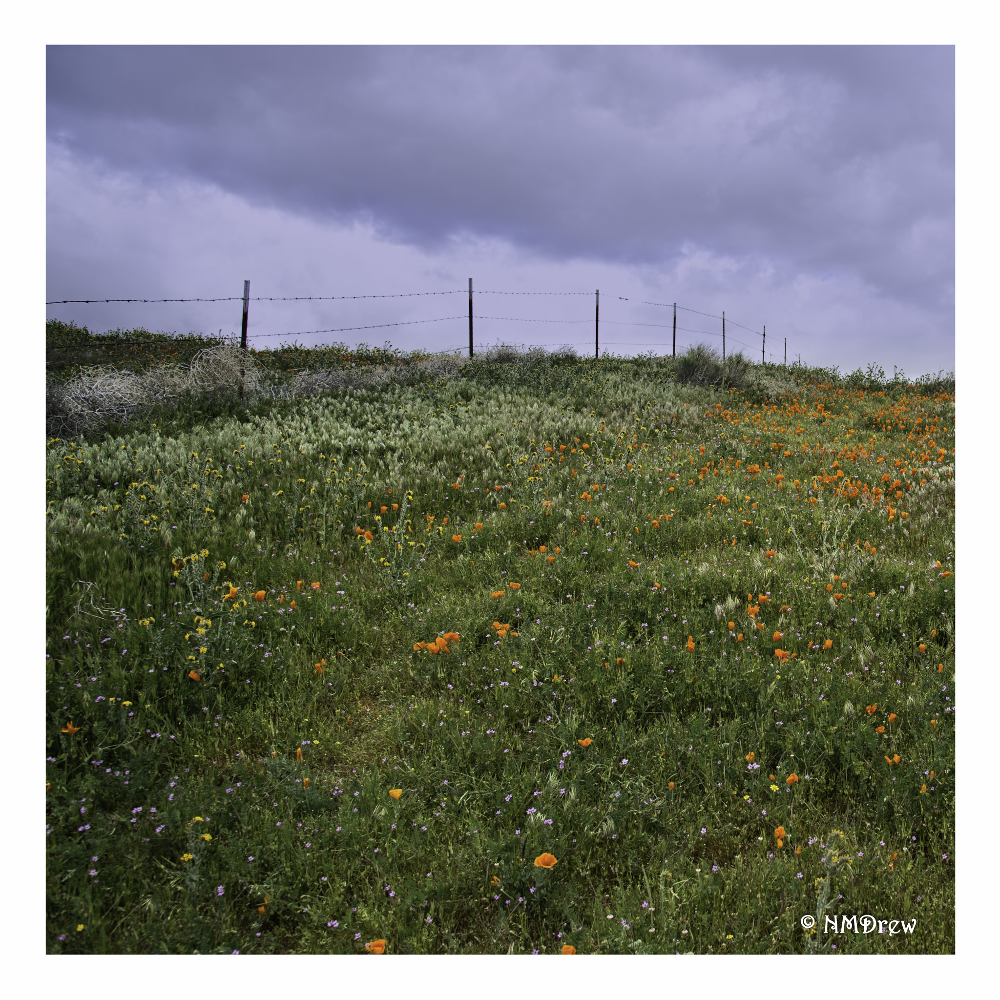 The California Poppy Reserve borders on private property, separated by that classical western fence of barbed wire. On the other side – but cropped out for aesthetics – was a jeep and a couple of guys, no doubt admiring the view, as were we tourists on this side of the fence!