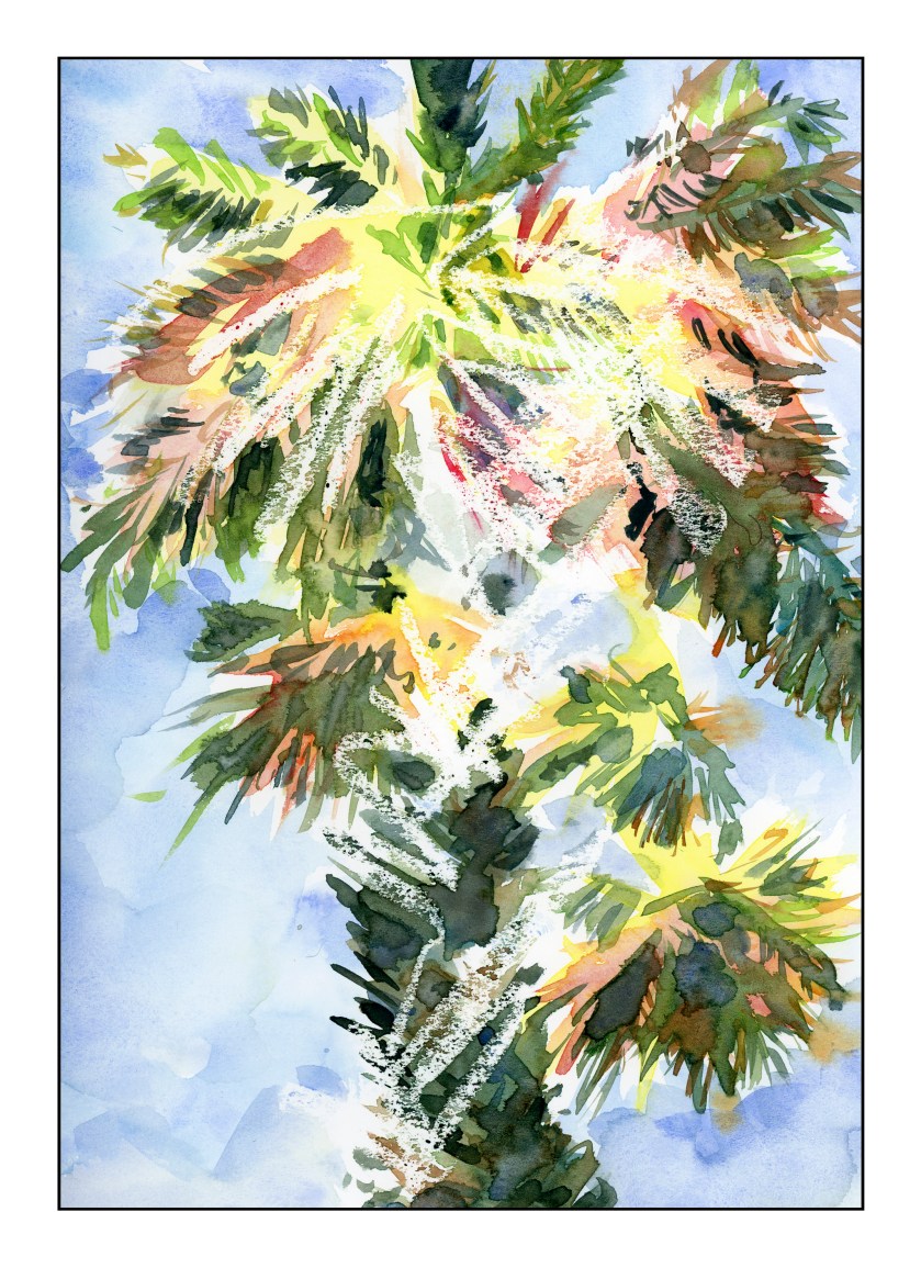A while back I read an article that a 19th century artist – it may be John Singer Sargent – used wax as a resist in watercolor painting. That was a bit of a surprise as I never thought a “professional” painter would do that. We used crayons and watercolors together in elementary school, and it was a lot of fun. Not having any crayons, I got out a white candle and scribbled away in a palm tree sort of shape. Then I painted, beginning with the yellows and then moving into darker colors. I don’t recall many of the colors I used, but they do include Yellow Ochre, Hooker’s Green, May Green, Payne’s Grey, Ruby Red, Cerulean Blue, Ultramarine Blue. The wax served to keep white spaces white, obviously. And, I actually used negative painting ti create some of the shapes in the fronds and trunk of the tree.