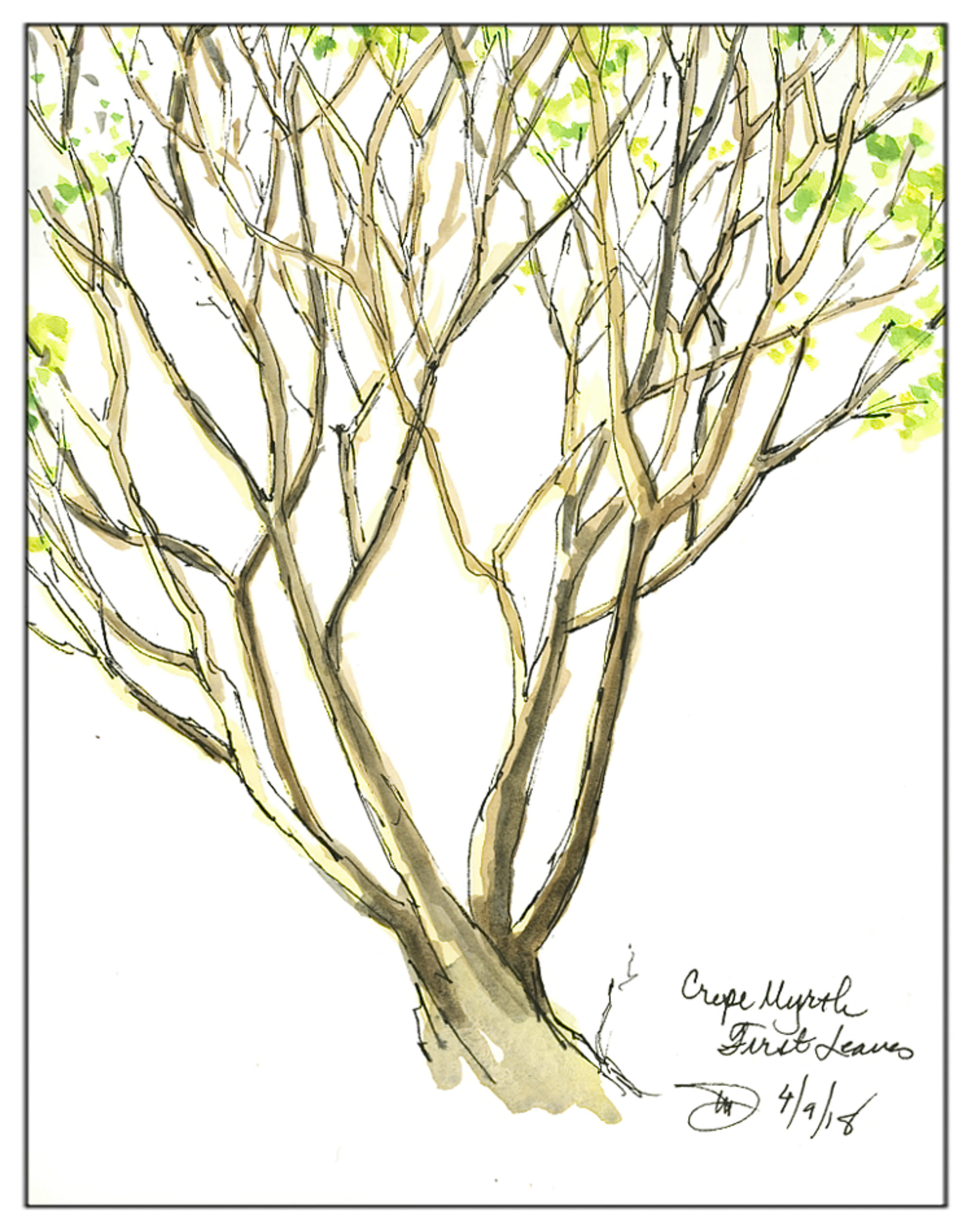 Back to work with a messed up wrist . . . wasn’t bad. After work, the sun was still out. In our yard, we have a beautiful vase-shaped crepe myrtle tree. It is sending out the first leaves of the season. I sketched this at sunset, trying to catch the complex interweaving of the branches and the delicate greens of the baby leaves at the tips of the smallest branches.