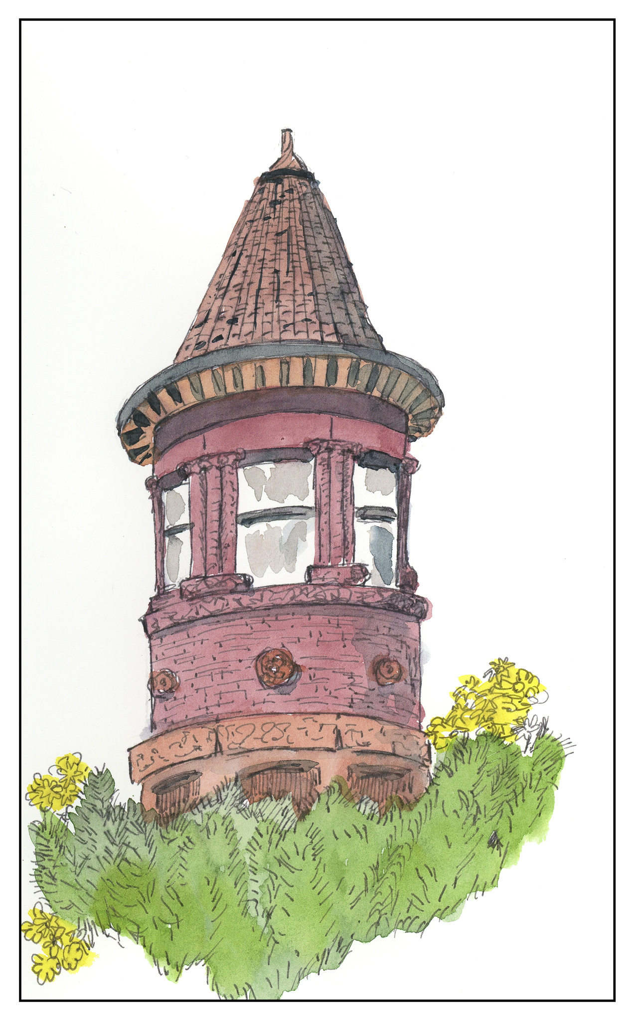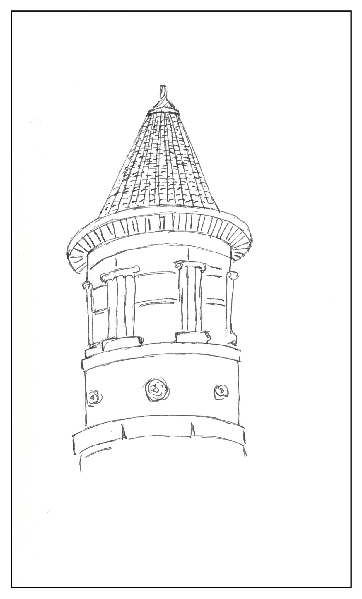 First drawing was in pencil, then inked over, and the pencil lines erased. I tried to keep the perspective – I am getting better at it – but there are still some errors.