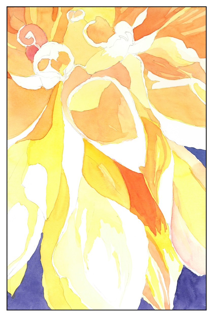 This is a WIP – from a black and white photo to consider light and dark. I am going to try to work on this one today, or the one below, which is from a macro photo of a dahlia or similar flower. I started this one in my Friday afternoon watercolor class.