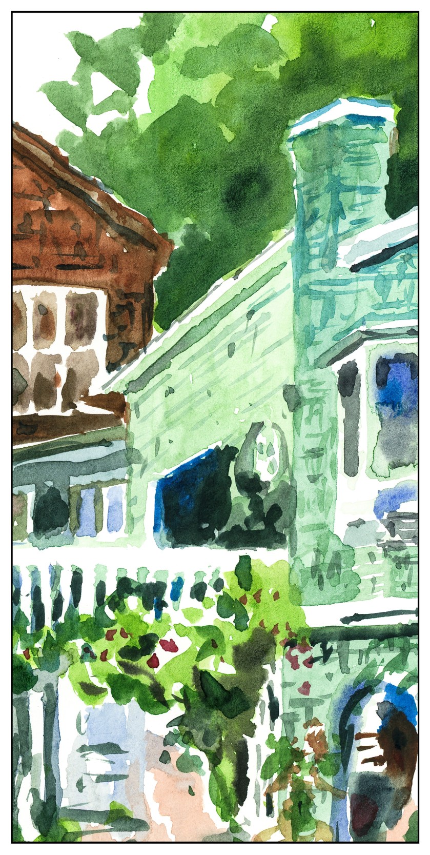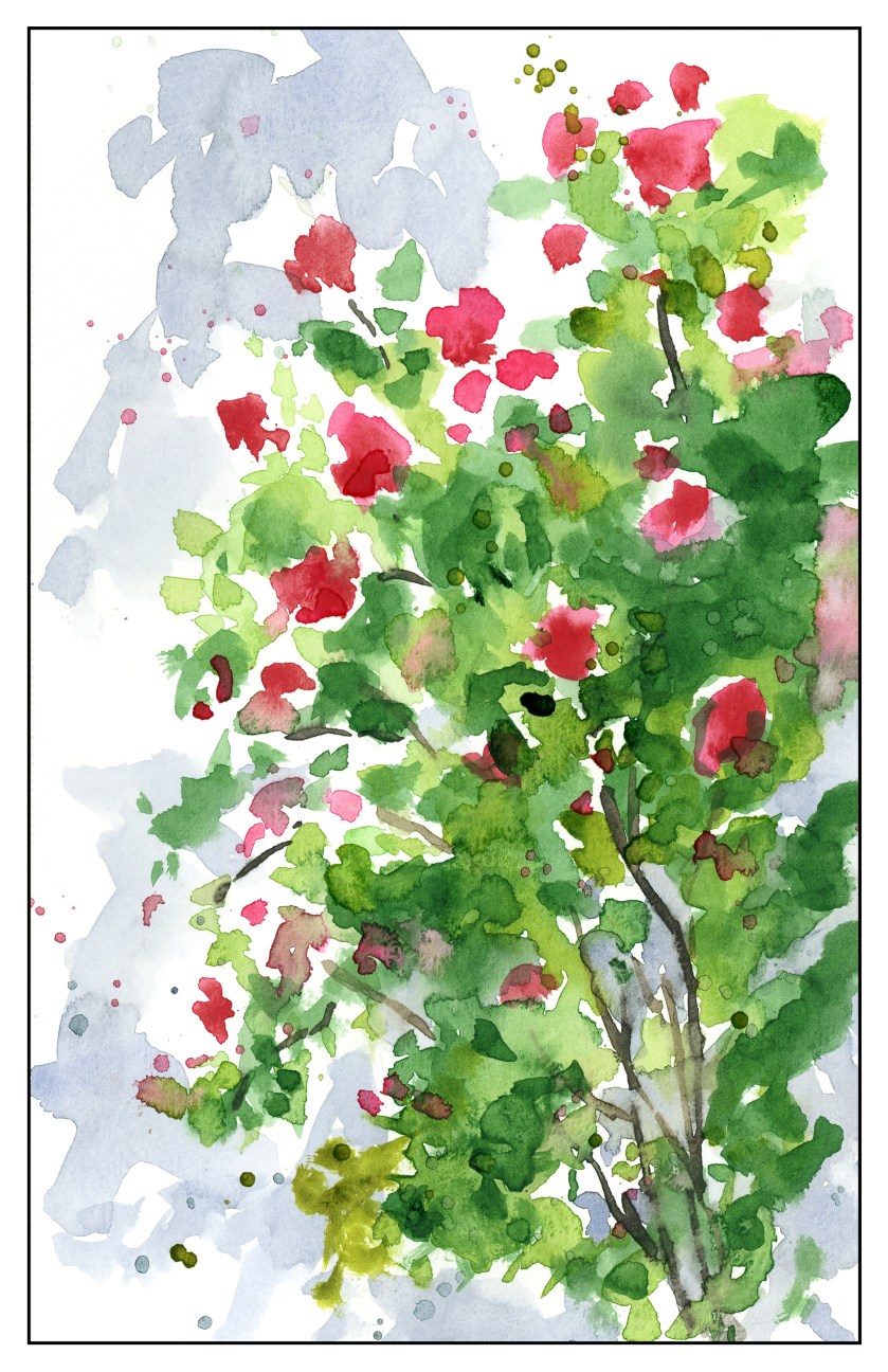 Lastly, sometimes just a quick interpretation can give a lot of satisfaction. There is something about light-colored walls on a brilliant day, colorful flowers – here, a rambler rose – and dancing shadows. I would like to do this one again, too, on a bigger piece of paper and a more formal and finished work.