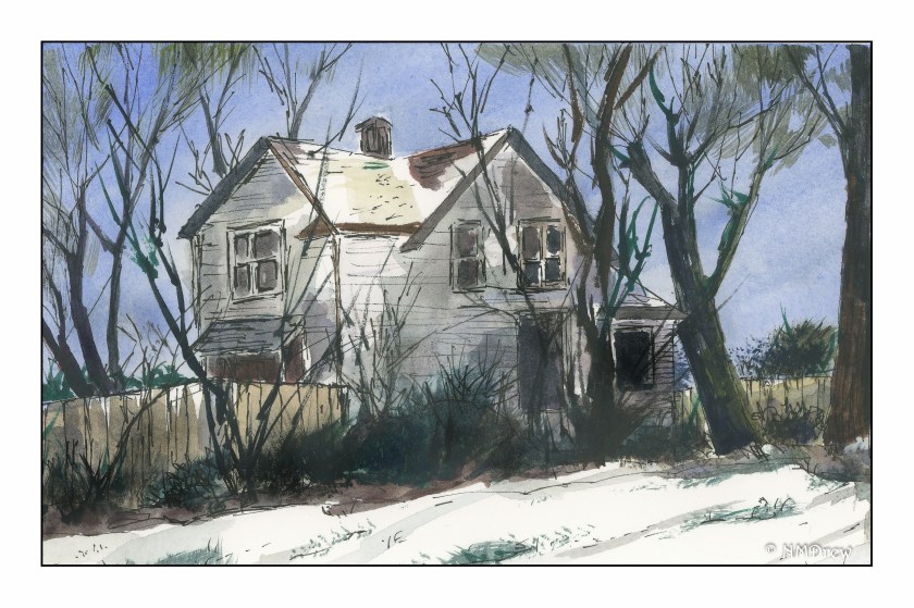 I haven’t had time to do any artwork for the past four or five days, and I can feel it.  Colors, ink, brushes all feel like aliens.  To counter this, I watched a Peter Sheeler video – his pen work is phenomenal – delicate, spare, assured.  The same may be said with his usage of color.  With this in mind, I went ahead and did this.  The inking is okay; I didn’t do any drawing in pencil, but went straight ahead with a Micron pen.  From there, I applied color and tried to keep it simple, but my usual messy style took over.