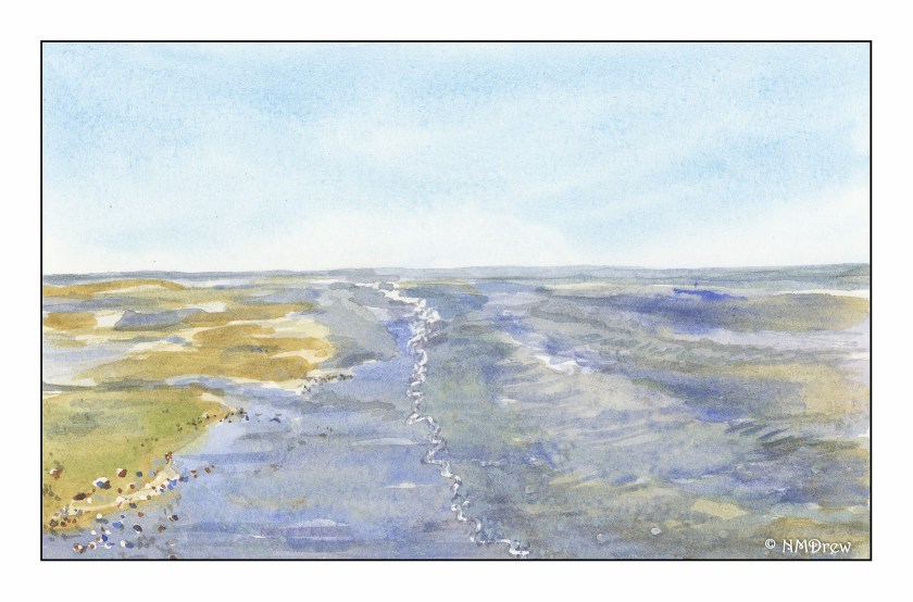 Carlsbad is a lovely beach town in Southern California.  The beach is wide and flat; at low tide it stretches forever.  Water is all you see to your left, to your right, and westward . . . The flat blue sky often blends into the ocean, making where one ends merge with where one begins.