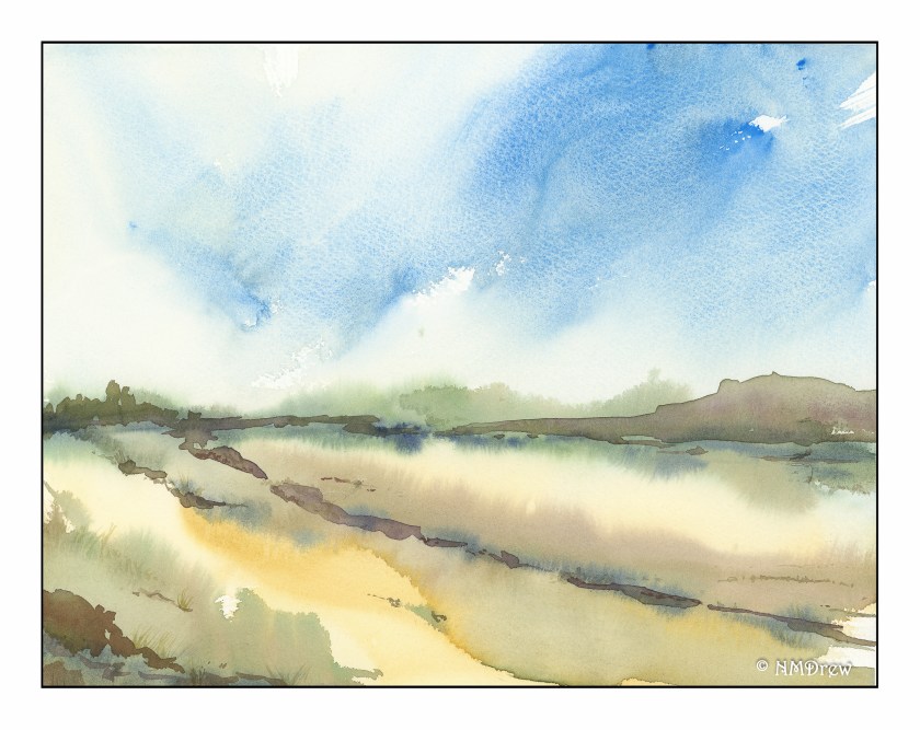 Flat land is like a calm sea. Few things break it up – perhaps a tree or a whale breeching. It is a challenge to compress the lines of the landscape into the narrow space seen to convey depth, space, and a sense of the land’s geography. The vast sky can dominate.