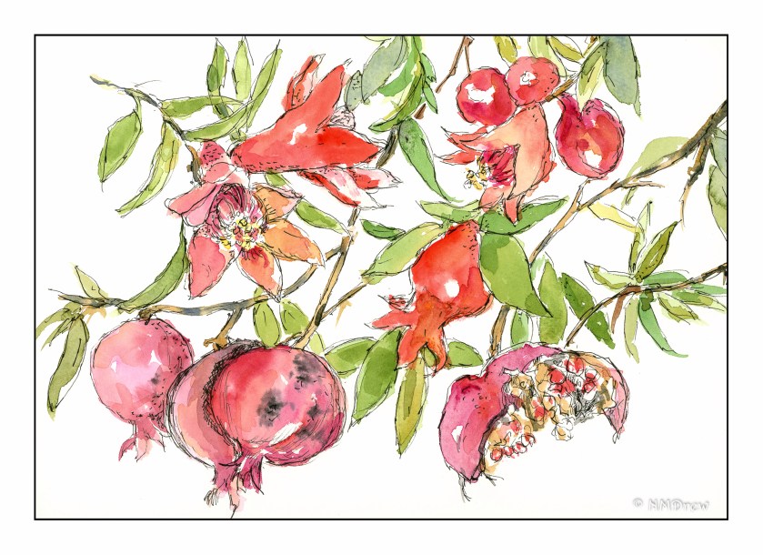 Here, the life cycle of the pomegranate, from flower to fruit to food for birds when it bursts open. The local botanical garden has several of these lovely trees, now in the stage of bloom and setting fruit. Large, ripe fruits come later in the year, of course. I don’t know why I thought of doing a life cycle, but it seemed like a fun thing to do – maybe a mirror of my own life cycle? Done with the weekly commute and such?