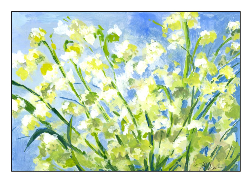 Today the idea was to just paint. No theme, just play. As I enjoy flowers, I picked a photo from Pixabay of Lilies of the Valley. Color scheme was simple – the usual white and some black or dark blue, but essentially blue, green, yellow, and white, along with complementaries to make greys. I had a lot of fun, and while I can see areas for improvement, there really is no need to as it is practice. And practice is fun if you let it be – so, I am letting it be and enjoying the result.