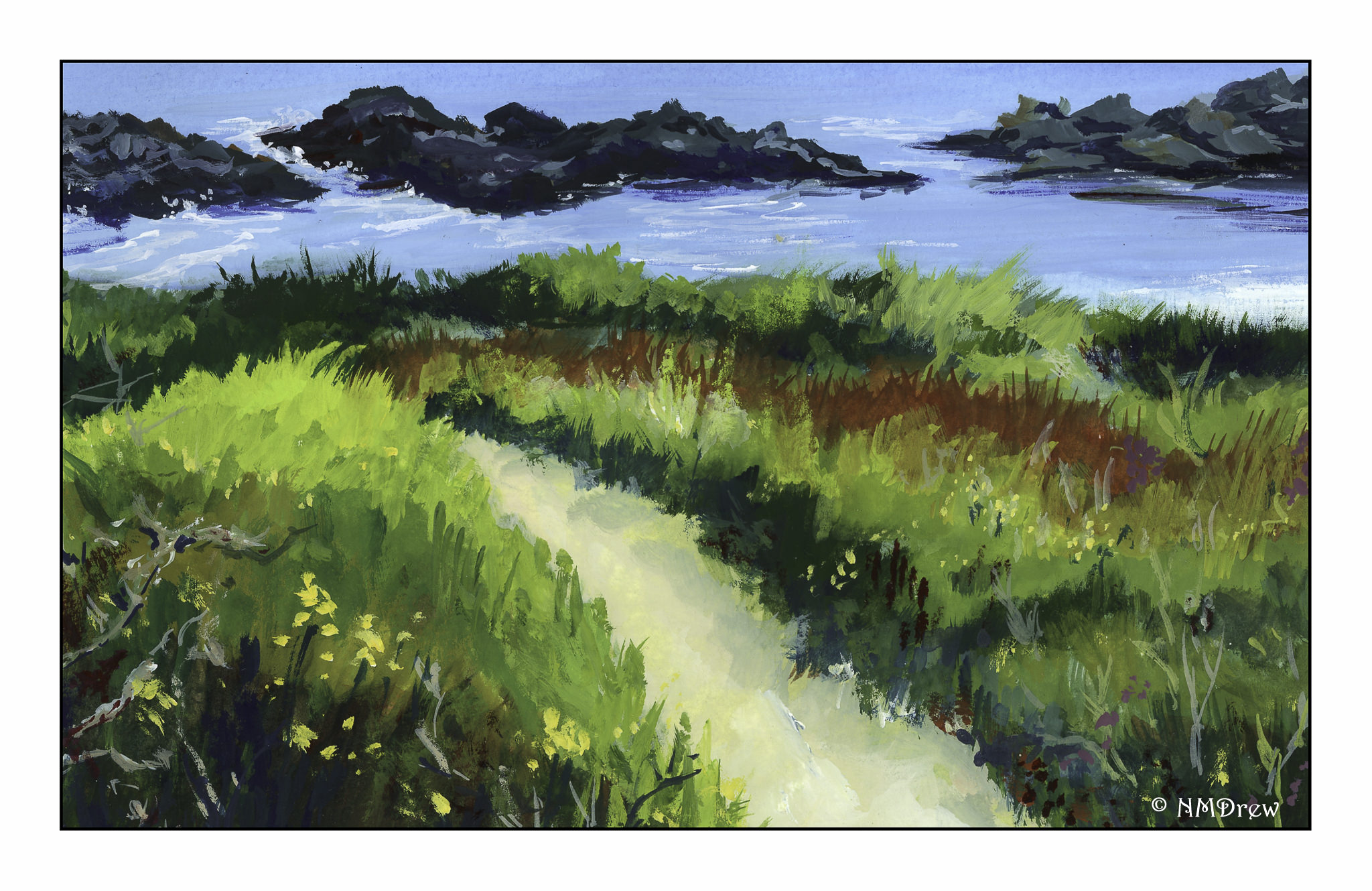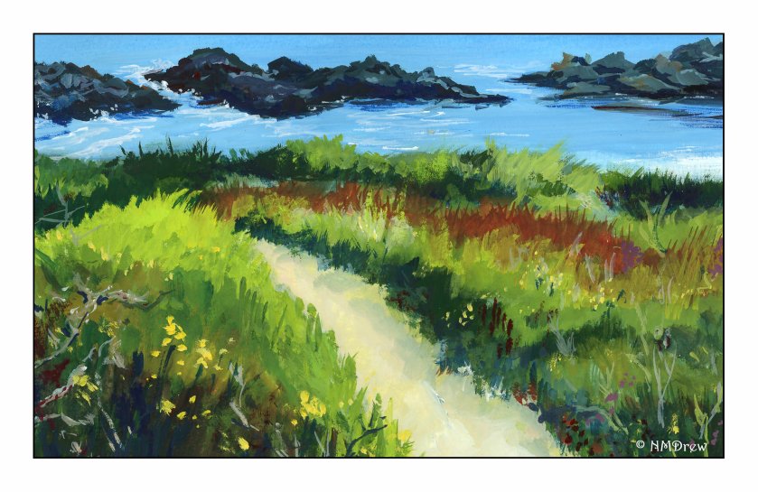 Above is one such example. Once more, my sense of depth is not the best. I tried to employ some of the techniques I know – atmospheric depth, less detail in the distance – but I really didn’t do a great job. In some ways, the painting sort of created itself. The path in the photo was curvier – way curvier – but it decided to become straighter as I painted. I just noticed that!