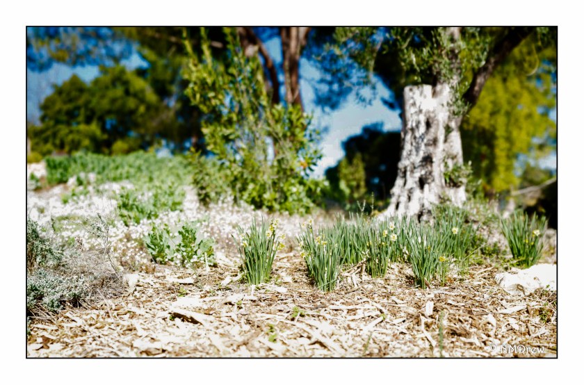 This is a panorama shot with a very narrow DOF. The focal point could have been better, but it is the row of daffs in front of the trees. The third clump in the very front from the left is best in focus, but I probably could have focused on the blooms in the second clump. Oh well.