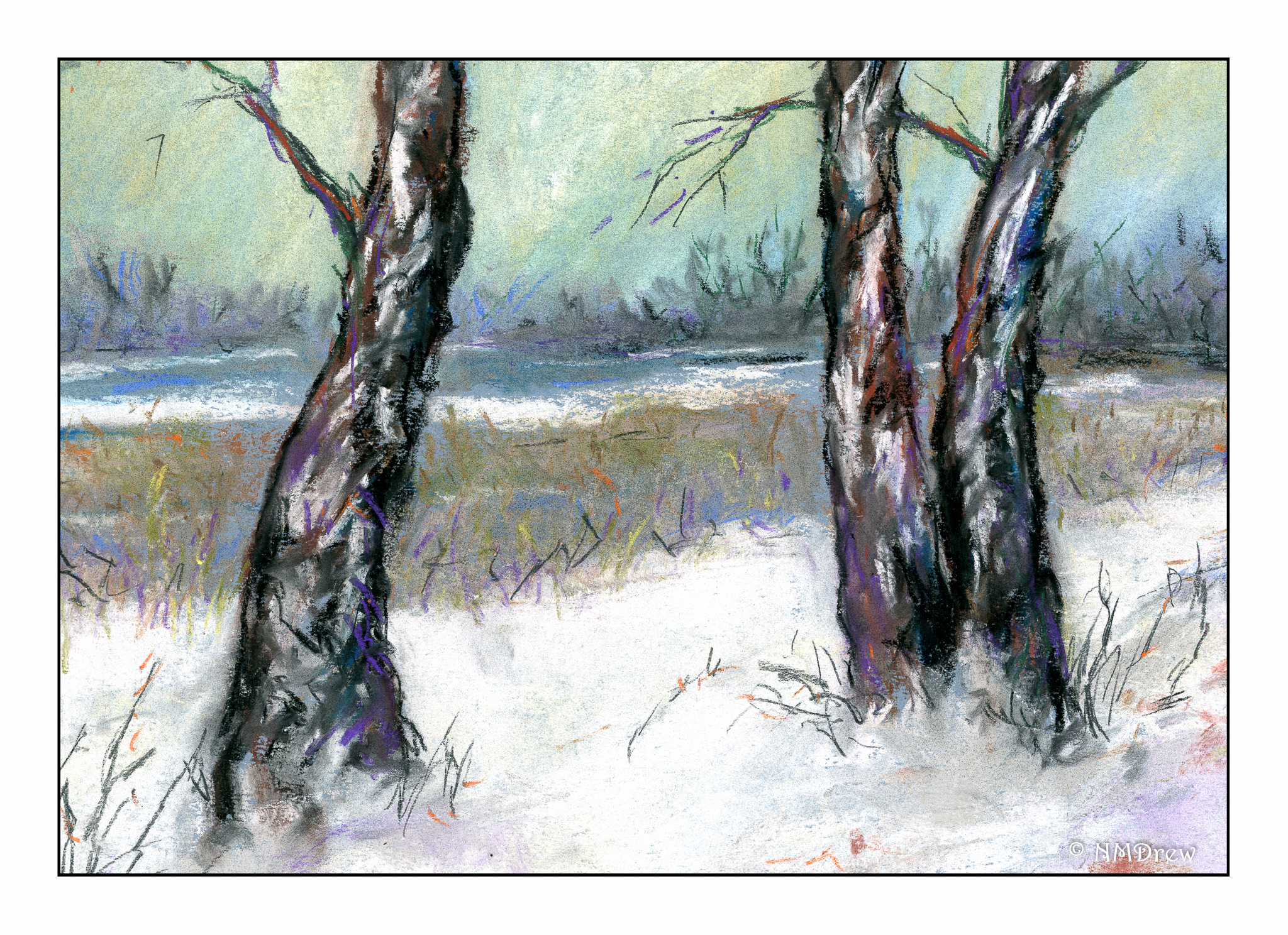 The snow on the trees was an interesting challenge. To accomplish it, I scribbled some pure white pastel onto it, and then used the tip of the torchon to blend around it.