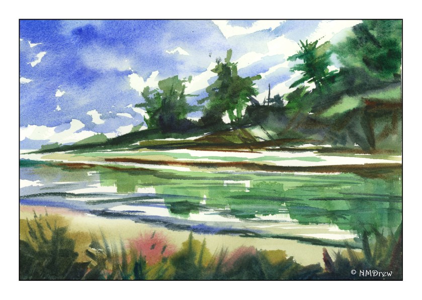 This one I wanted to work on contrast, saving white paper, and creating shapes with the 1/2 inch brush. I was pretty pleased with the results, but the foreground was a bit of a puzzle.