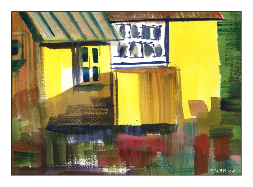 Finally, this yellow house has been calling out to me, but a yellow house is not that interesting in and of itself. But, a series of shapes to make a house became the idea after doing all those abstractions before it. Here, a 1 inch brush and a bit of thought. I like this one because it is cheery, has white paper showing through, and is showing me what I can do with pure colors.