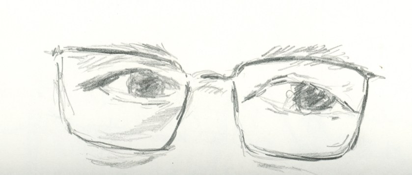 The next lesson in Keys to Drawing is to draw your own eyes! I can’t see past my nose without my glasses, so it was a bit of a challenge. Here I am, blindish and glasses-less.