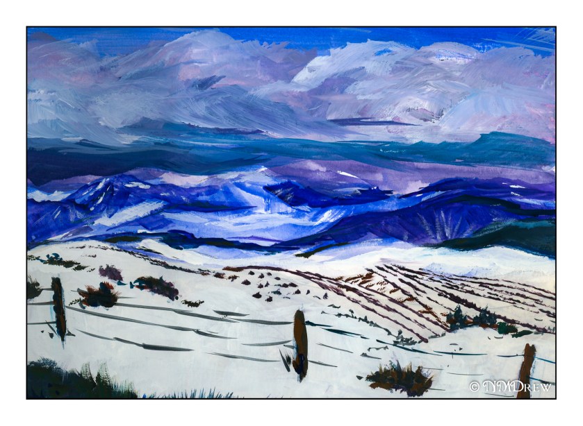 More winter, more gouache. A limited palette of white, phthalo blue and green, ultramarine blue, a bit of red, and black and purple.