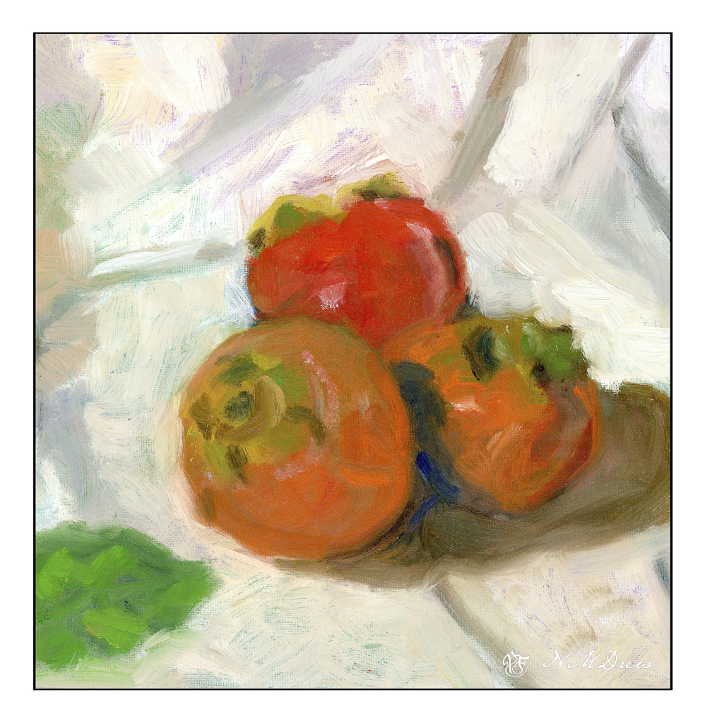 I will continue to paint in oils for the most part. Acrylic paint may provide an underpainting at times. Evolution can be a bit of fun, and these persimmons have been a real delight so far.