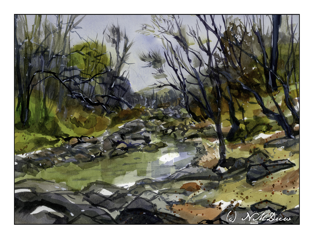 For me, this is a rather complex painting. Rocks and sandy shore, trees and brush, water, sky and reflections in the creek. Remembering the “rule” – simple big shapes, moderate shapes, details last, I worked by creating the most noticeable areas – or certainly the ones I felt could be the most challenging. This meant the creek in particular – keeping the water marked out. As well as that, the shoreline in the foreground coupled with bits of sandy shore on the right. After that, the rocks on the left and foliage of trees. I was all over the place working larger to smaller, light or dark, and then on to light or dark details.