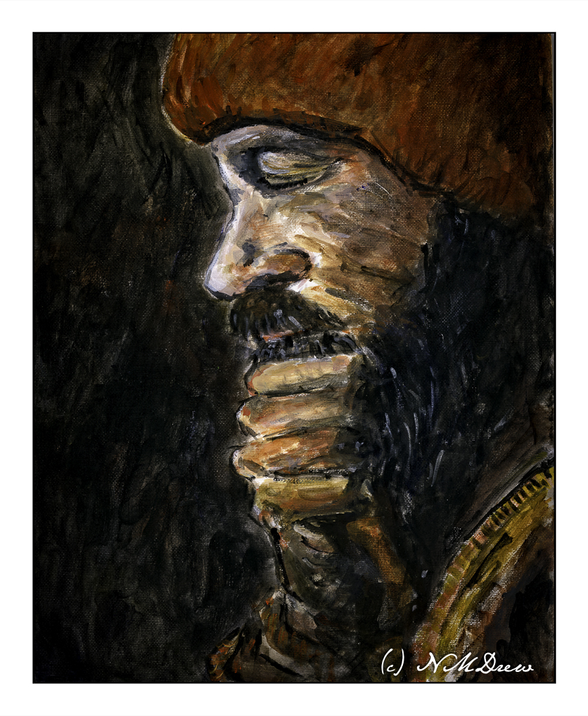 Painting this portrait was a challenge. I did not want to do a photographic reproduction. My idea was something moody and a bit sketchy, more so as I think such a style is more easily done in acrylics (which I swore to work on!) than a realistic rendition of the person himself. I painted using more transparent paint and scumbled a lot of the paint onto the canvas. Some areas don’t even have paint on the surface, or very little. Layers and glazes were built up. The quick drying quality of acrylics makes this easy to do in a classroom.