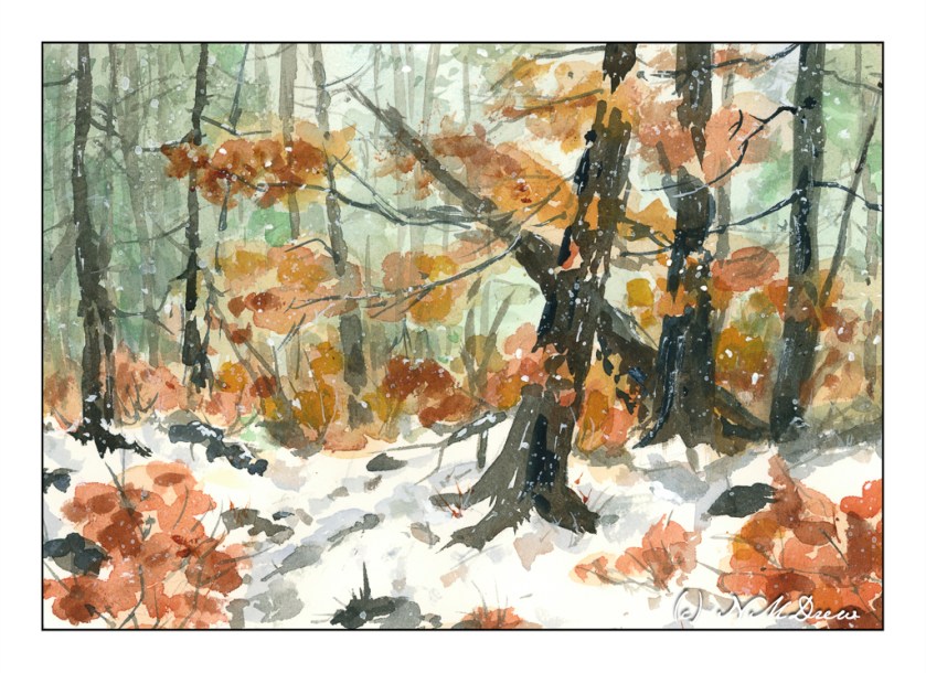 Here I worked from very light to dark. The colors I used for the greenish-blue sky were cobalt teal, a bit of ultramarine, and a touch of Hooker’s green, neutralized by a bit of alizarin. The leaves and autumnal foliage were various siennas and orange with a touch of Indian yellow. Trunks, from light to dark, were essentially ultramarine with burnt sienna and raw umber with a bit of Payne’s grey. Snow shadows were ultramarine and Payne’s grey. Finally, I watered down some titanium white gouache and tapped my brush across my forefinger to look like falling snow after applying a few lines and dots in white here and there.