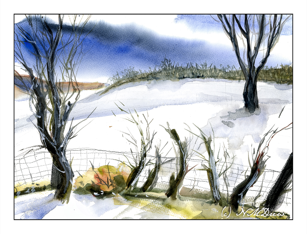 I added some new colors to my palette for this painting. In addition to ultramarine blue, burnt sienna and Payne’s grey, I added some Winsor Newton brown madder and olive green, and McCracken black by Daniel Smith. I also used some white gouache for the snow on the right hand tree and in the viney-like things in the foreground along the fence. Altogether I am working toward getting comfortable with a limited palette. Winter lends itself well to this.