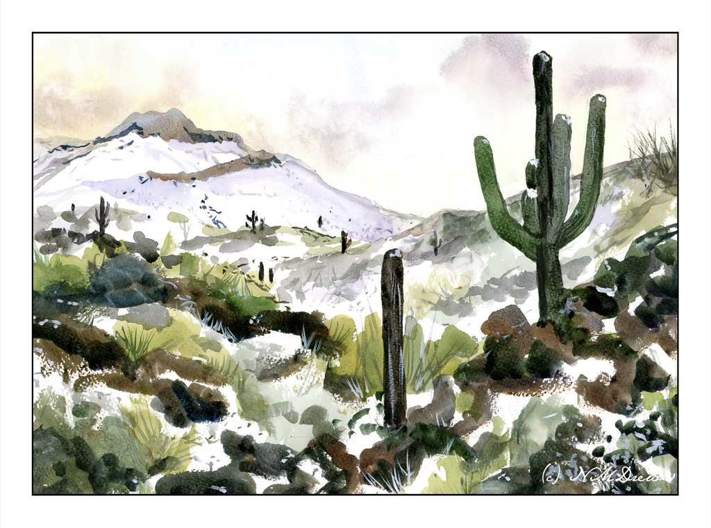 It seems appropriate to do a version of a western snow scene, and what better place than the Sonoran Desert? It is a bit closer to home than New York. I always find snow in the desert or places I don’t think of getting snow to be absolutely fascinating.