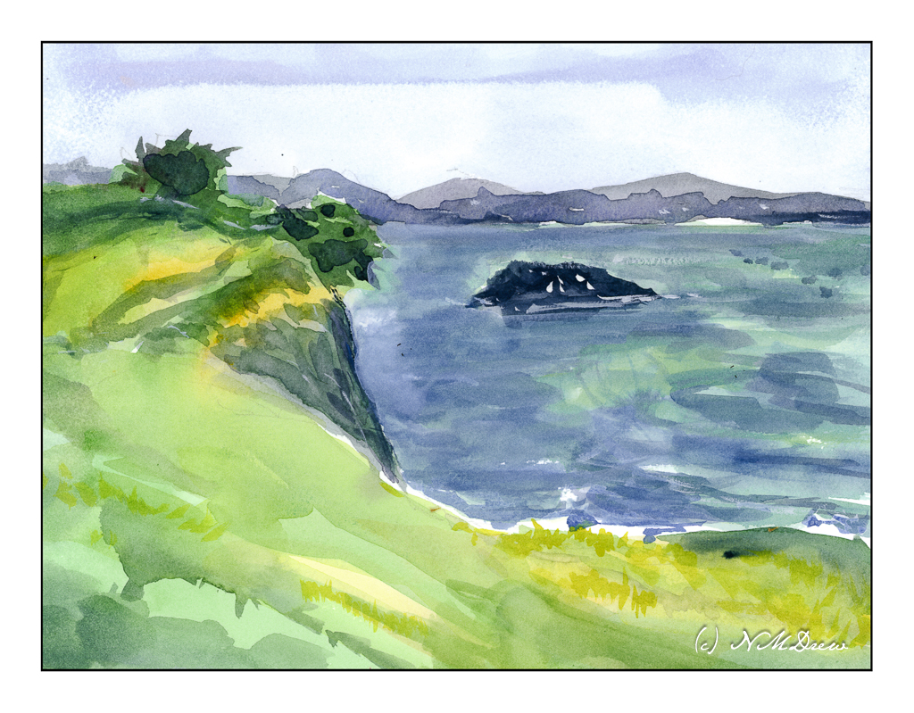 Despite these issues, I really do like the Millford paper. It has a nice texture. Water rests a bit longer on the surface than other papers, allowing bleeds and such to work well together. In the first painting, I lifted a bit of color out of the island, just to see what happened, and it held up well. Additionally, the glue around the edge of the block was light enough to allow for easy removal of the sheet without tearing the paper – I have had this issue with Arches blocks decades ago, and that has been a big turn off. The glue around the edges of the Arches paper was tough. Perhaps I shall revisit it . . .