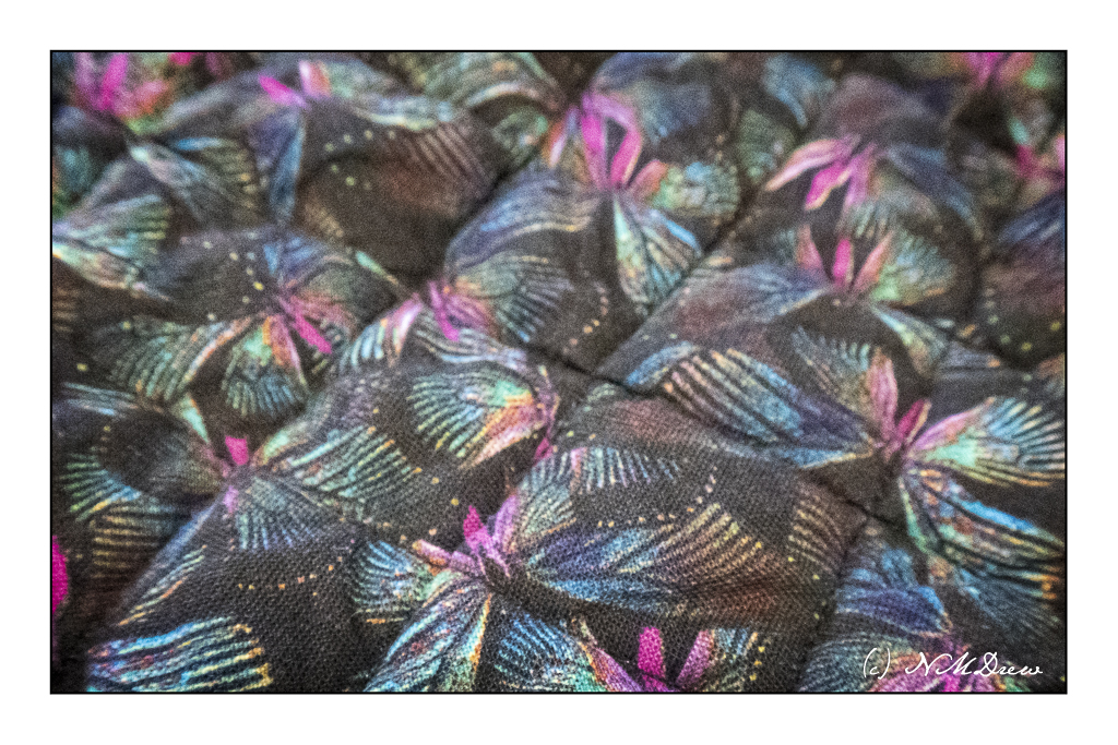 Here is a close-up of the fabric. I didn’t pre-wash the material, which is a quilting cotton. I put each potholder together, batting, fabric, and quilted it before throwing them into the washing machine. I like to do this whenever I have made anything quilted because the cotton shrinks and the quilting becomes more prominent.