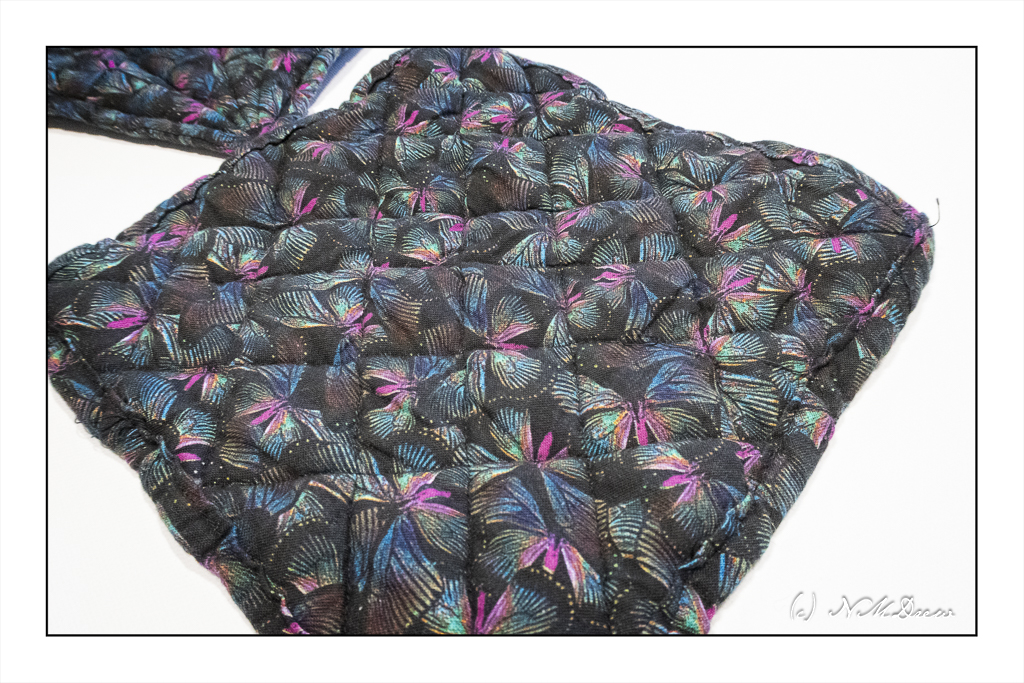 When I quilted, I worked diagonally across the fabric. I think this made the fabric stretch and pull out. It got rather annoying. Next set of potholders – yes, there will be more – will be quilted along the warp and weft as much as possible.