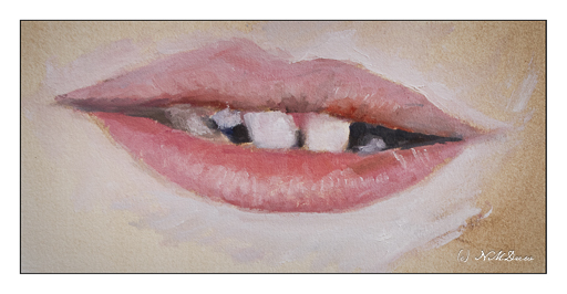 This study is from a photo of a kid just getting his adult teeth. Snaggle-toothed and chapped lips, so it was a pretty realistic photo. As this was my first painting on the Arches “Huile” I dipped my toe – well, my brush – in a bit gingerly, getting a sense of paint on paper. My brush was really small, a flat synthetic.