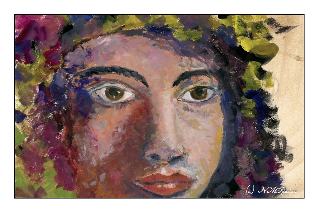 This oil painting is far from what the original person looks like. Does that matter? To me, what I like here is what it makes me think of – a figure emerging from the woods, perhaps a vineyard, an ancient goddess from Greek mythology. Who could this be?