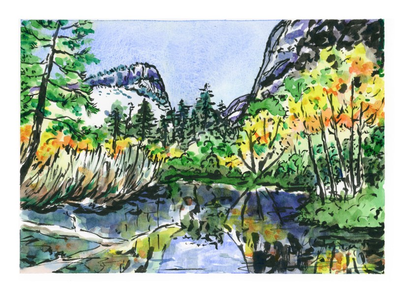 Paper is Canson’s watercolor paper, and colors include quinacridone yellow, cobalt teal, carbazole violet, ultramarine blue, burnt sienna, Hooker’s green, alizarin crimson, Payne’s grey, and a few others.