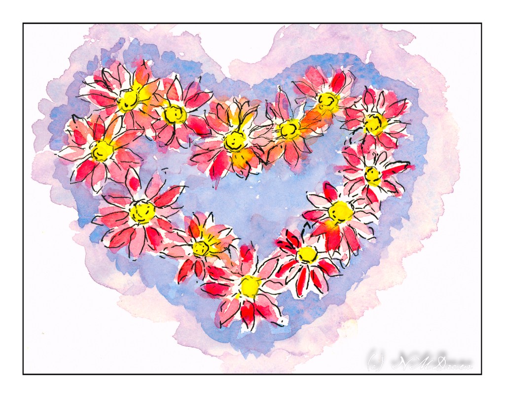 Flowers in the shape of hearts – why not? I thought of this as I was drawing some cards for my SIL as a Christmas present – something she always likes. It’s a chance to play with ink and colors, too. Some are more successful than others. Strathmore makes boxes of blank cards which are perfect for this – and it includes envelopes, too. For some reason I always have more envelopes than cards . . .