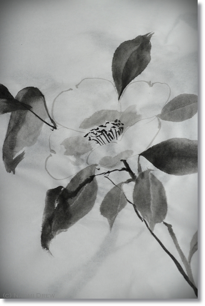 I chose to focus on the camellia, or tsubaki. There is a lovely painting demonstration by Kazu Shimura, as well as other images in sumi-e throughout the web if you google. Photographs help, too, ones you might take or you might find.
