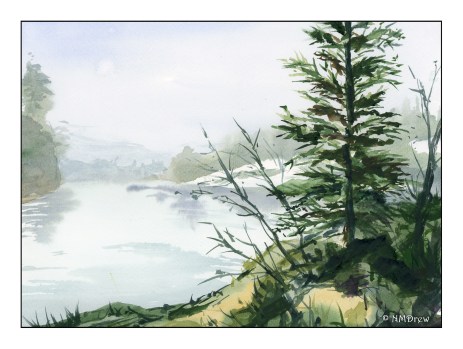 Foggy Lakeside Morning – Watercolor – 6-18-2020