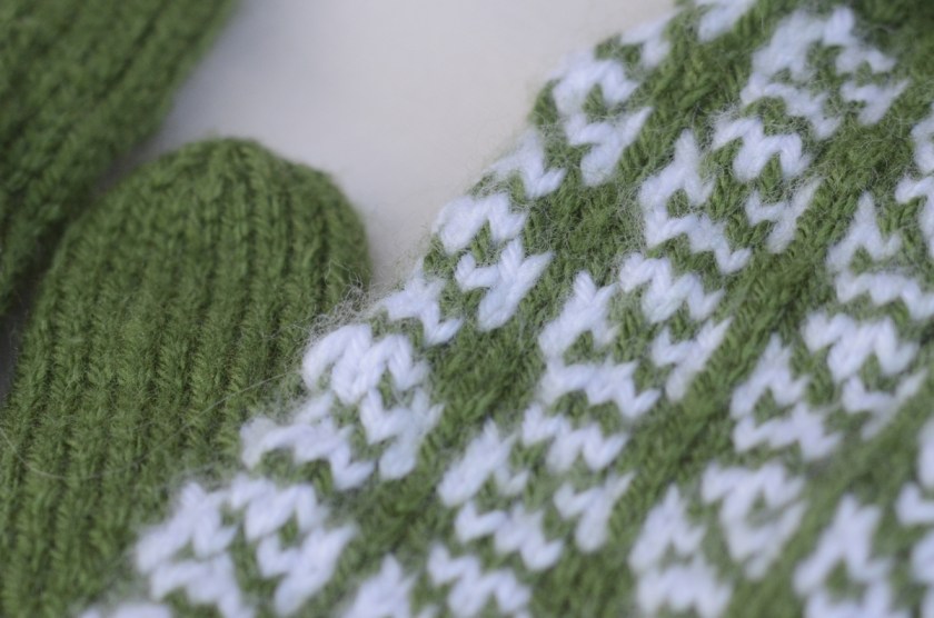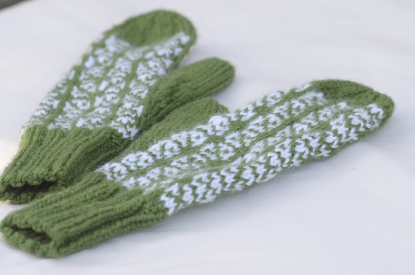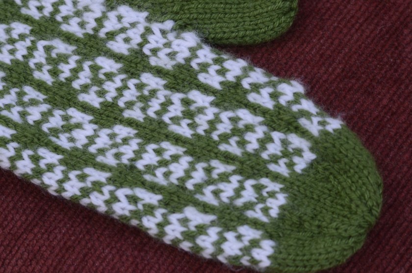 A classical mitten, this one made me think of spider webs strung between leaves. Or, snowflakes in a pine wood.