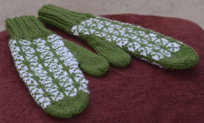 These mittens are snug-fitting, and require the ability to carry yarn and do stranded knitting. In the thumb area, especially, an easy hand when catching long floats is necessary, otherwise the gusset will be puckered.