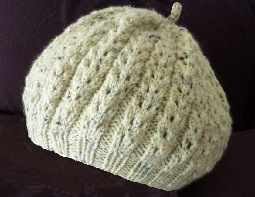This simple beret knits up quickly and easily, using less than one skein of worsted weight yarn.The eyelet rib provides visual and knitting interest, as well as a stretchy hat that can accommodate your hair when you just don’t know what to do with it! Tuck it up and pile it into this attractive hat.