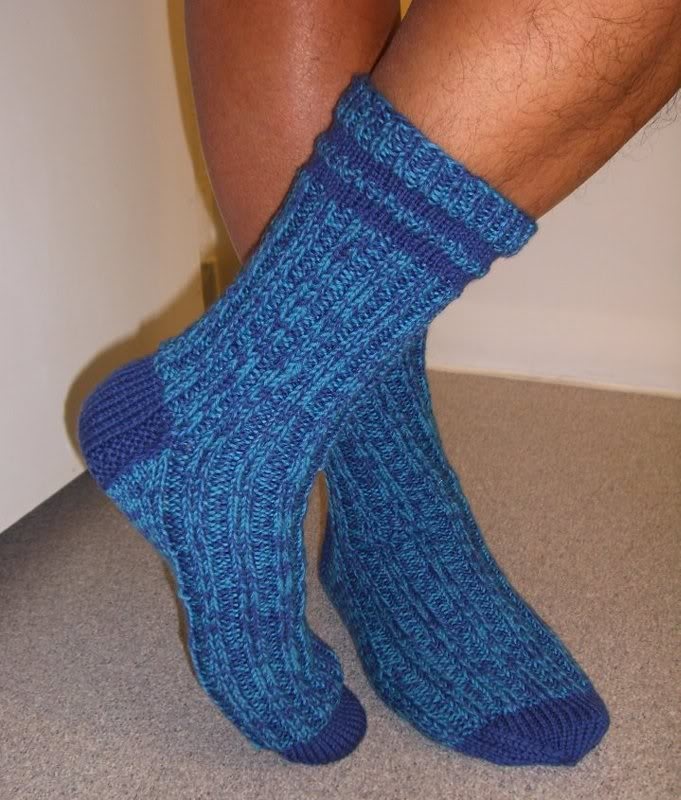 A very good friend of mine has been providing me with some of his catch every year. One day he mentioned cold feet from a long day of fishing. My way of saying “Thanks for all the fish!”Using two strands of sock-weight yarn held together, these are warm socks which knit up quickly. Easy enough for the beginning sock knitter, or a hurry-up pair for a last minute gift.