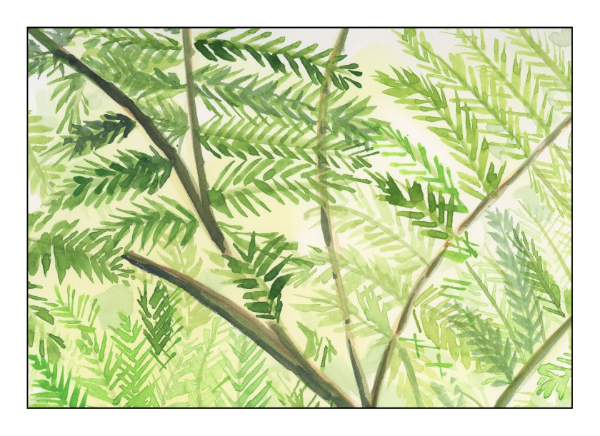 This morning I decided to do a free form watercolor of the tree ferns I photographed. I didn’t draw in any lines. As you can see, the stem on the left goes nowhere…amazing how you notice things when you see them in a scan!