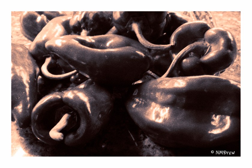 A holiday weekend means connecting with others. It also is time to spend making massive amounts of food for the next week or so, or even month – cook it up and freeze it. Here, a pile of ancho chilis waiting to be roasted over a high gas flame, charred and peeled, before joining garlic, onions, tomatillos, herbs, and pork to cook slowly for several hours into a delectable stew.