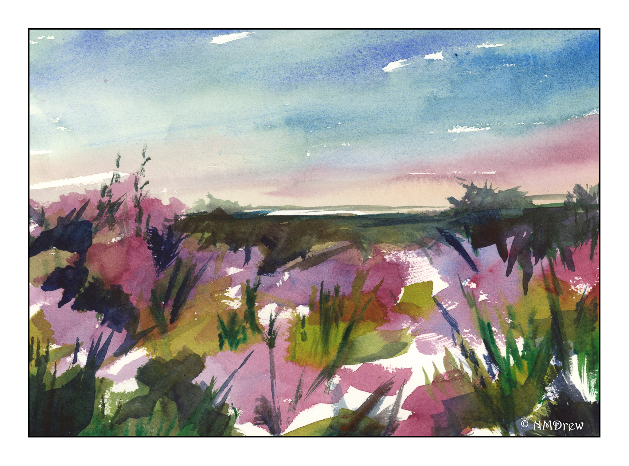 From there, little details were added, such as leaves, extra contrast, and so on, all using various tricks common to watercolor. In the end, once all was dried, the frisket was removed and little bits of color added here and there over the white areas. Lines, bits of color.
