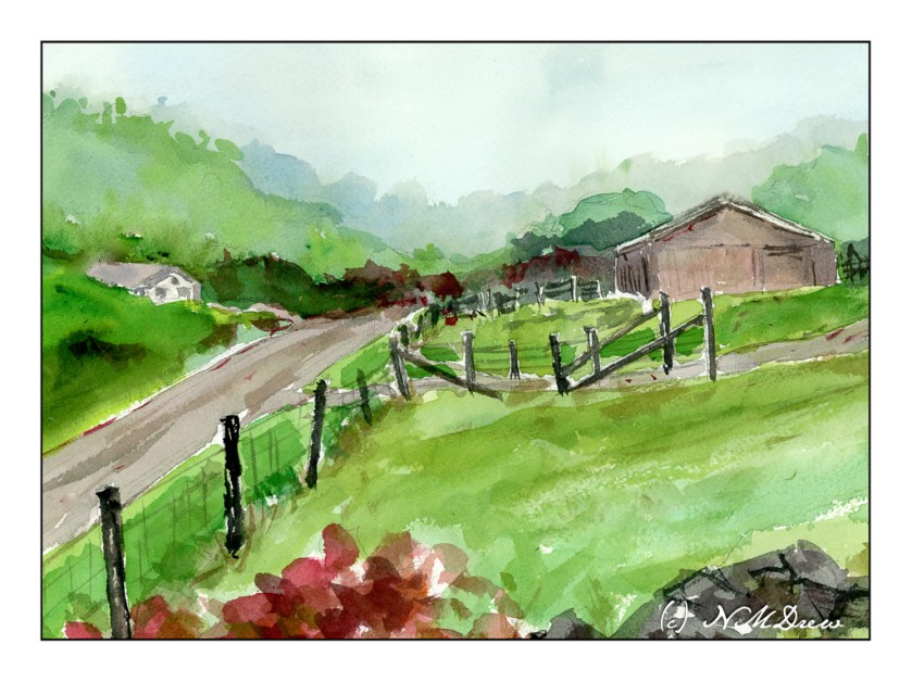 Watercolors, Arches 140# CP, 9×12. Cad Yellow Med, Pyrrole Orange, Ultramarine Blue, Burnt Sienna.
