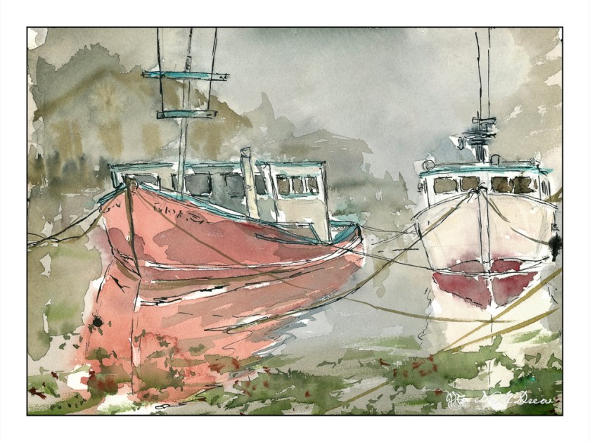 A good mechanical pencil with extra lead is also a requirement, along with a kneaded eraser, some Pitt or Micron pens with permanent ink, a collapsible water cup, and plastic eye dropper or two for wetting the paints. I will most likely stuff them all in a large waterproof zip baggie or something like that, as should anything leak, some things may be spared. I expect I will be doing inked sketches with watercolor, like below, during the trip.