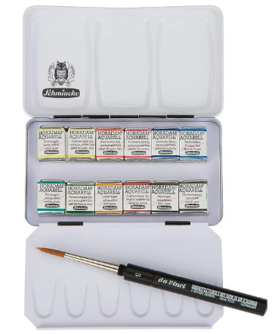 I finally decided on this small half-pan set from Schmincke – it includes a small travel brush, colors I am likely to use, and to which I could add more if I want, I think. I like Schmincke’s pan paints a lot as they are designed specifically for being in a pan, and this way, too, I don’t need to bring tubes with me. I will keep them wrapped up until I begin my voyage – no idea what crazy laws might prevent me from bringing them along.
