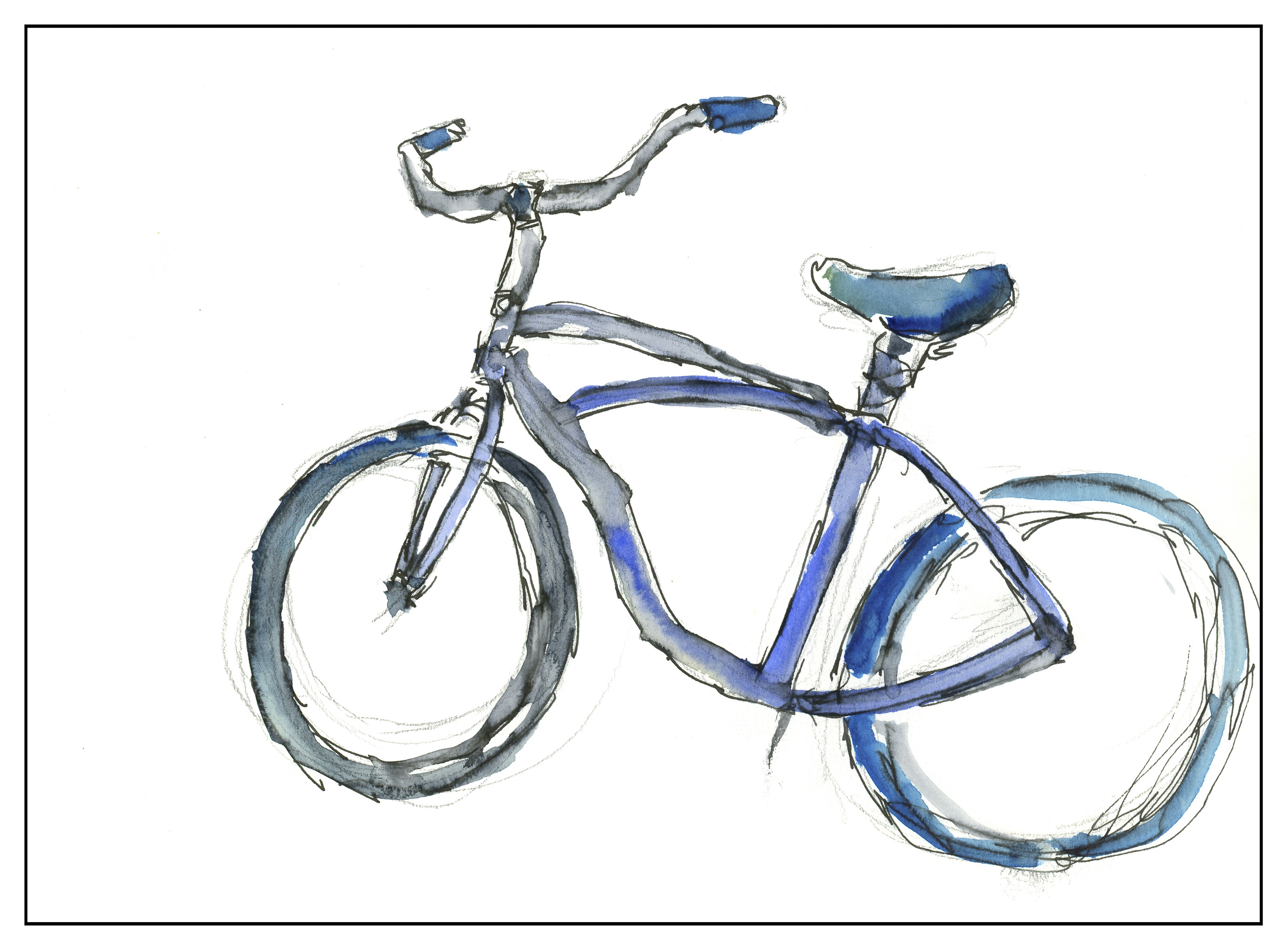 I’ve never drawn a bicycle, much less painted one, in my life. Welcome to my first attempt! Rather out of proportion – wouldn’t want to ride on those wheels – but did get it to be recognizable.