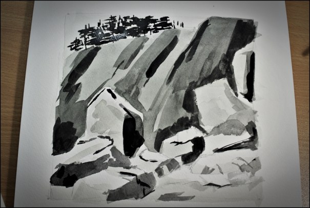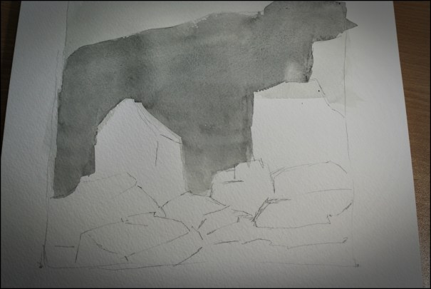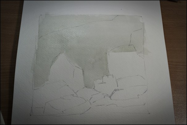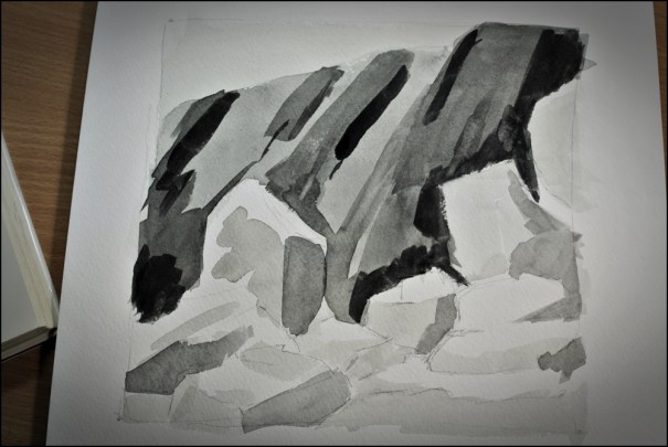 I have 3 flat brushes that I used here. None feel comfortable, but they were worth using. One is an inch wide, and then they each decrease by half. Awkward! The point, though, is to just do it. That is how we learn. I know I will work more on the flat wash this week, and use the flat brushes. It won’t be pretty – but it will be a good experience!