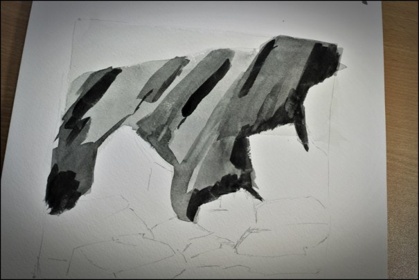 This, then, is the study for the flat wash. Here, dry layers are built up, one on another, as can be seen in this picture of the study. Below are all mine, which are absolutely hideous, but did teach me a bit about contrast and painting. Or remind me of it. Or something.
