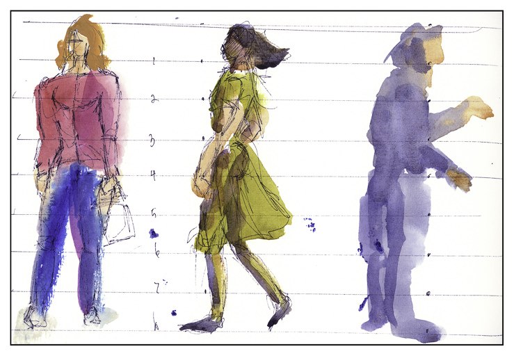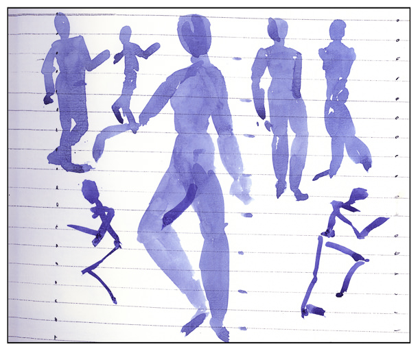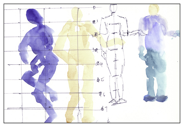 To begin, I obviously did a sketch, and obviously also depend on the sketch to let the viewer know these are (supposedly) daffodils. I painted the blue around the drawing first – working the dark in against all traditional watercolor rules. Then, the vase. Then a loose blobbing of yellow, darker yellow, some greyed yellow for shadows, and a touch of orange for the centers of the flowers. The leaves happened somewhere, and final daubs of darkestness to accent things.